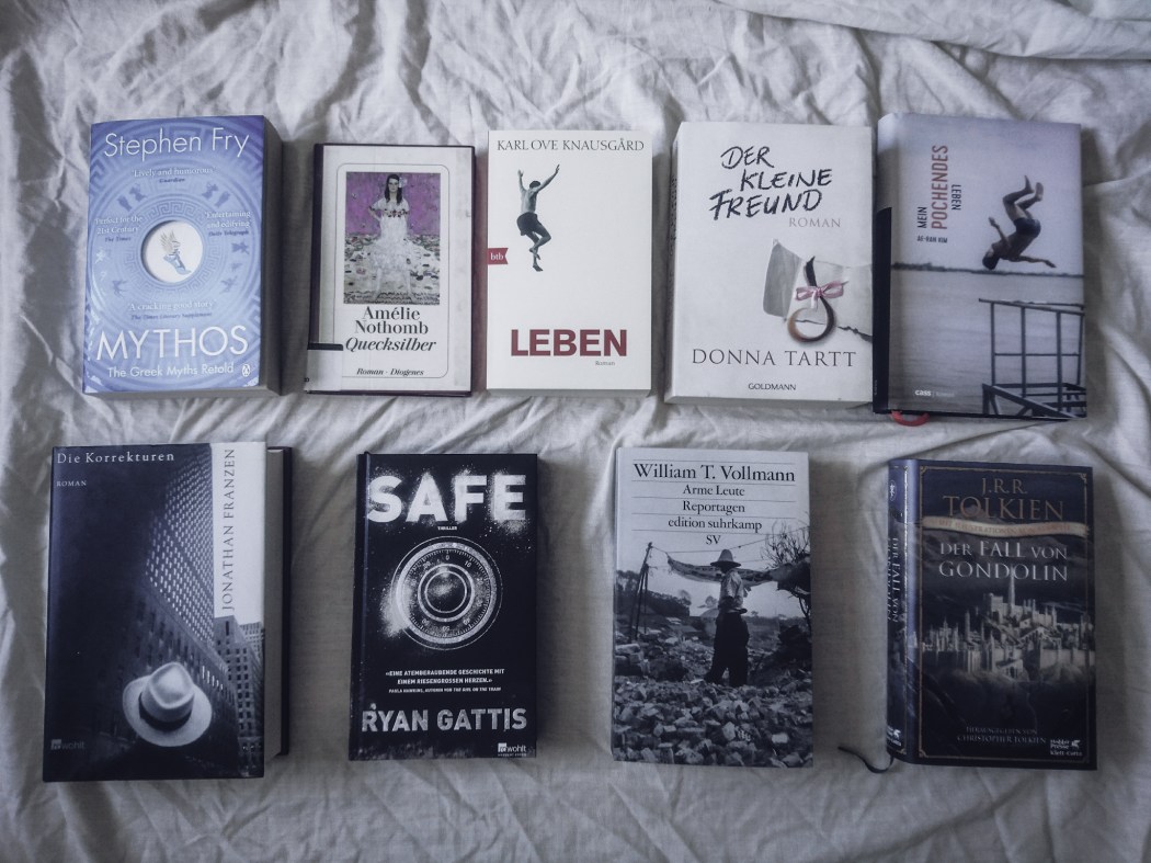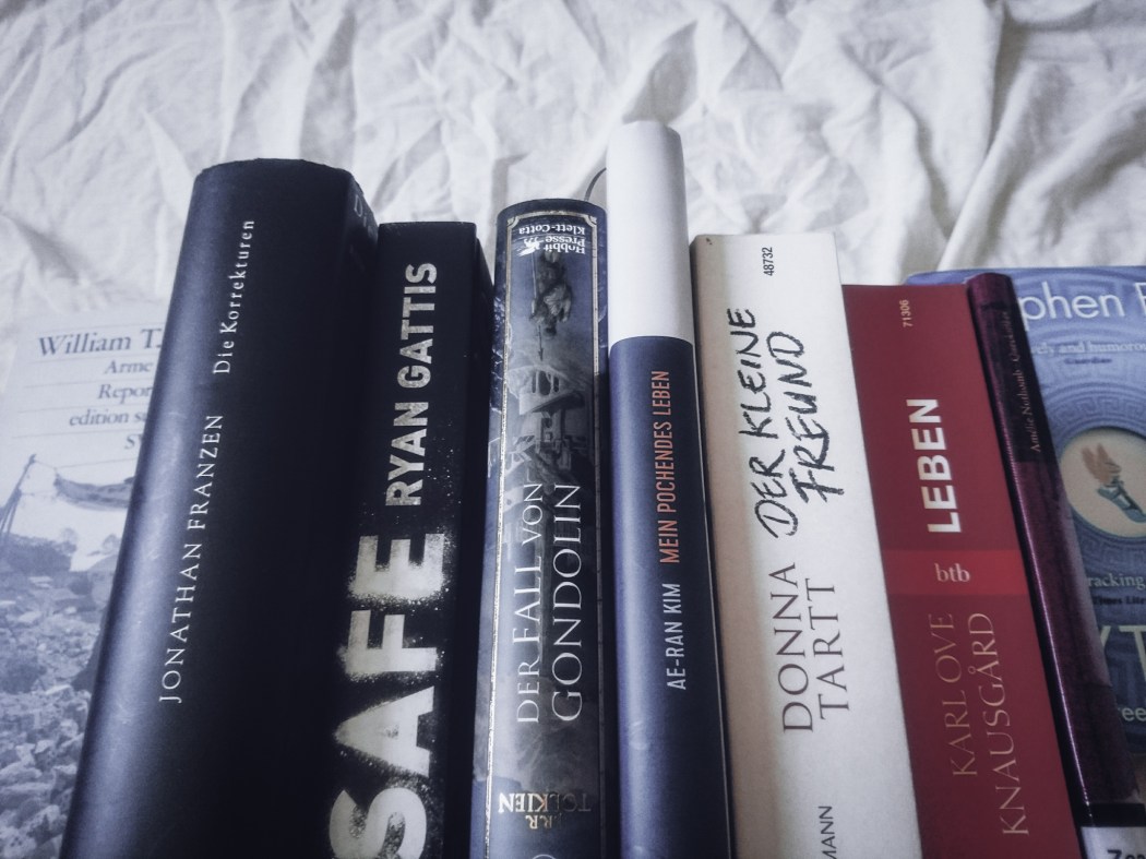 Pünktlich zum Monatswechsel haben wir unseren aktuellen literarischen Rückblick für euch. Der August brachte uns zwei tolle Neuerscheinungen – Ryan Gattis und J. R. R. Tolkien – sowie einige andere bekannte (Jonathan Franzen, Donna Tartt, Karl Ove Knausgård, Amélie Nothomb) und weniger bekannte (Ae-Ran Kim, Stephen Fry, William T. Vollmann) Autoren. Was wir genau gelesen haben und wie unsere Eindrücke der Bücher waren, erfahrt ihr im Folgenden.